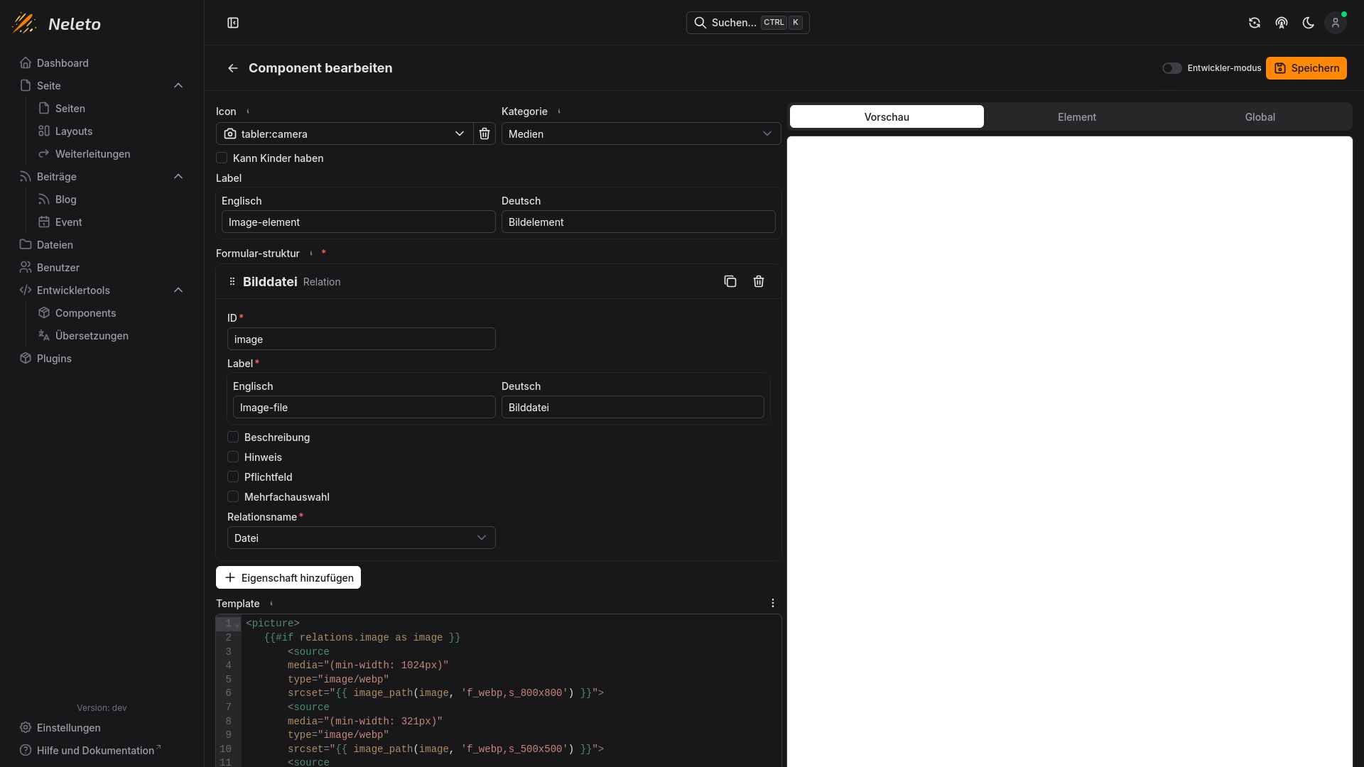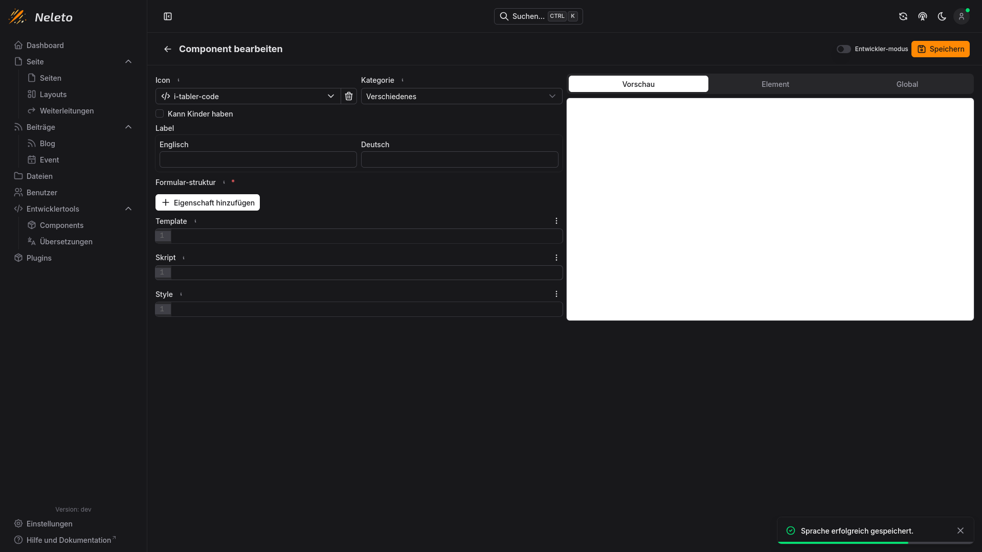 Das Label wird über dem Formular im Pagebuilder angezeigt. Deshalb solltest du dieses Label in Deutsch und Englisch definieren, weil das Neleto Admin-UI zwischen diesen Sprachen wechseln kann.