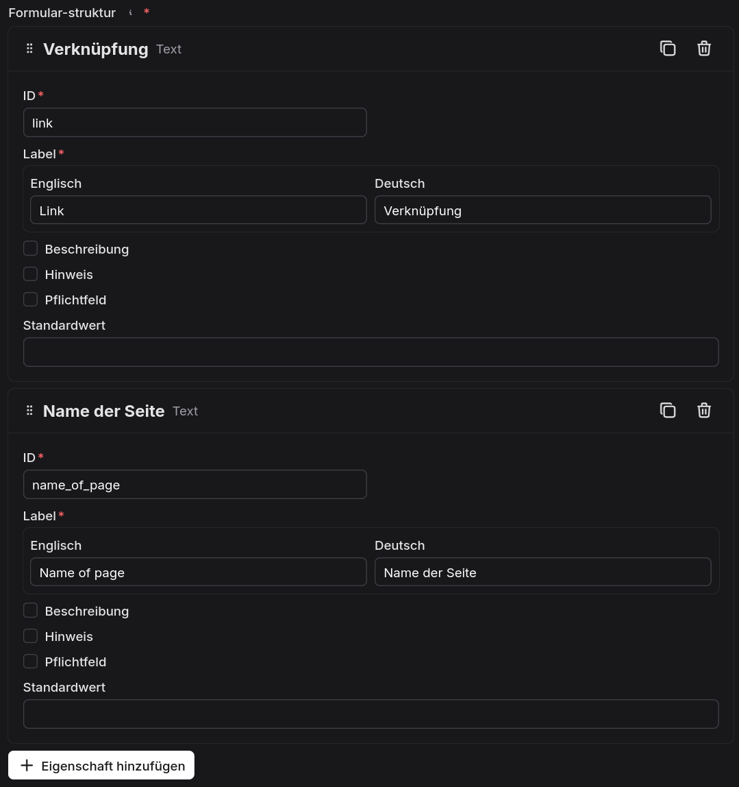 Hier definierst du die Struktur der Daten, die du bei der Verwendung dieses Components bearbeiten kannst. Diese Daten kannst du direkt im Pagebuilder bearbeiten. Hier ist ein Beispiel mit zwei Textfeldern: