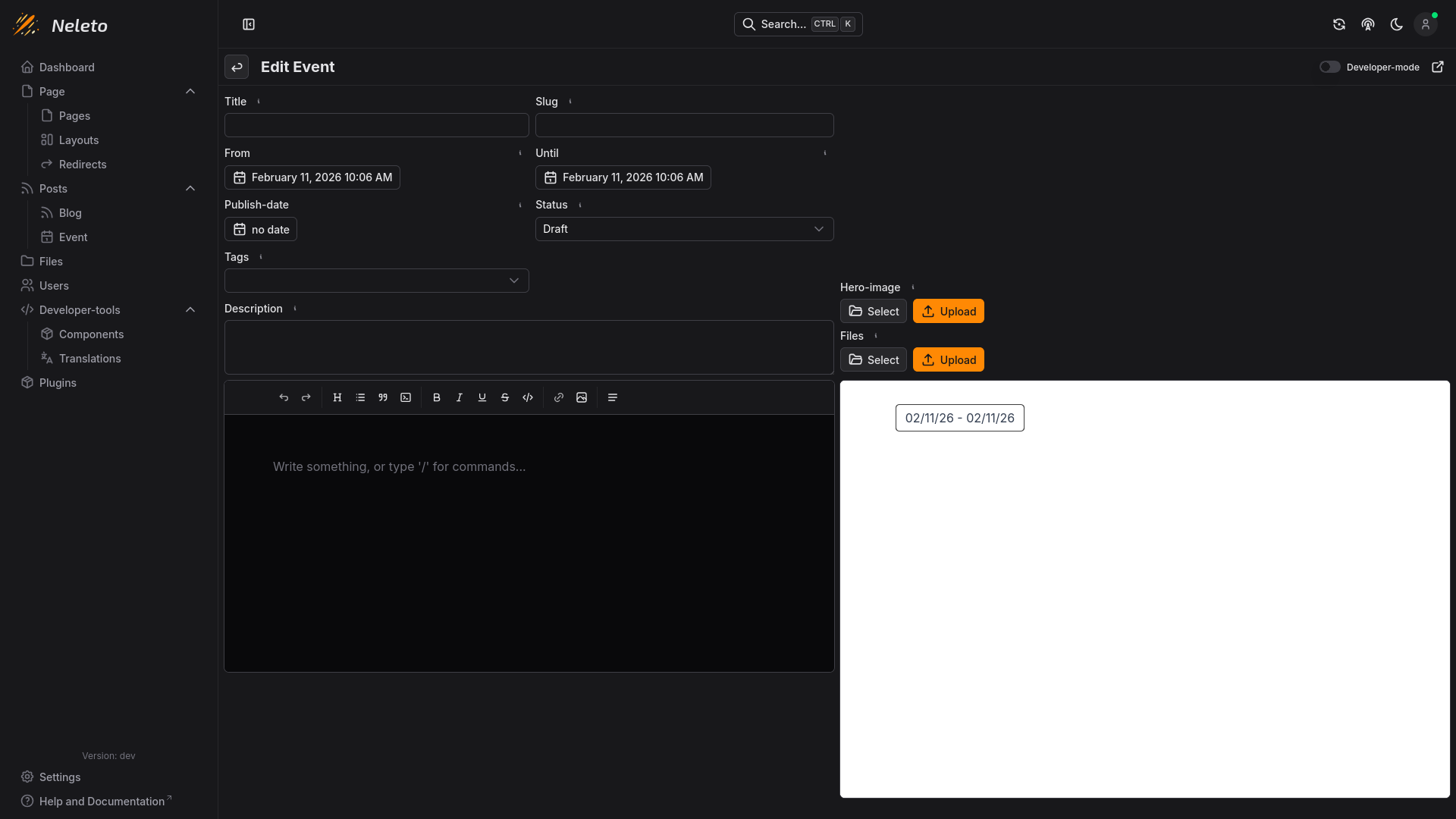 Here you can set a cover image for your event. Your event content component dictates how/if this is rendered when visiting this event.