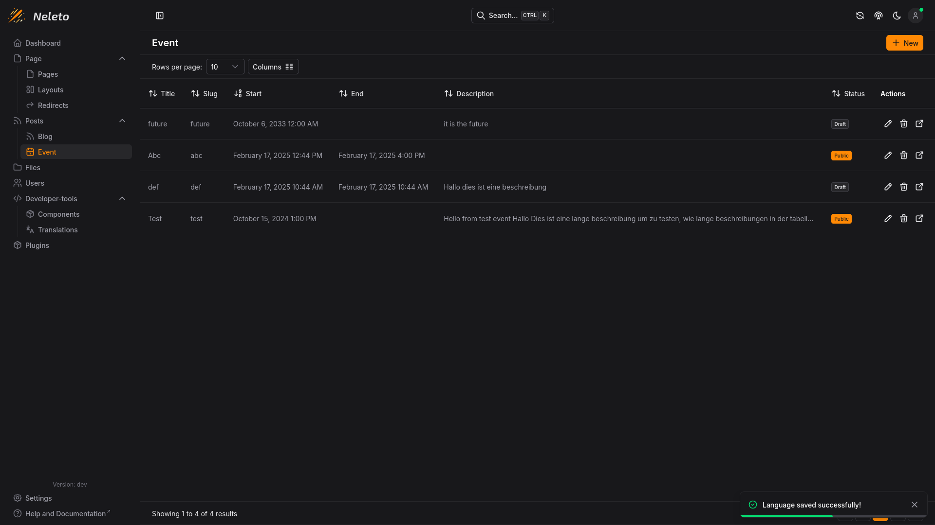 To manage events, navigate to the Events page in the Posts section of your Neleto instance.