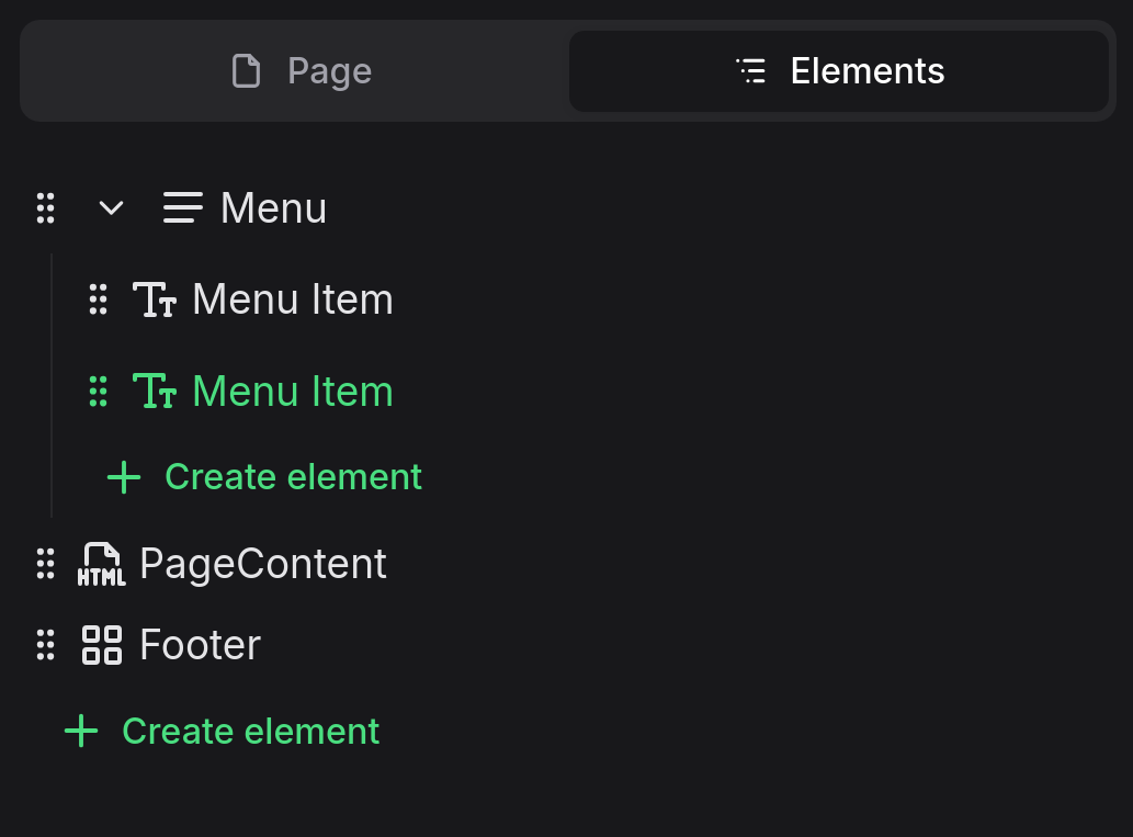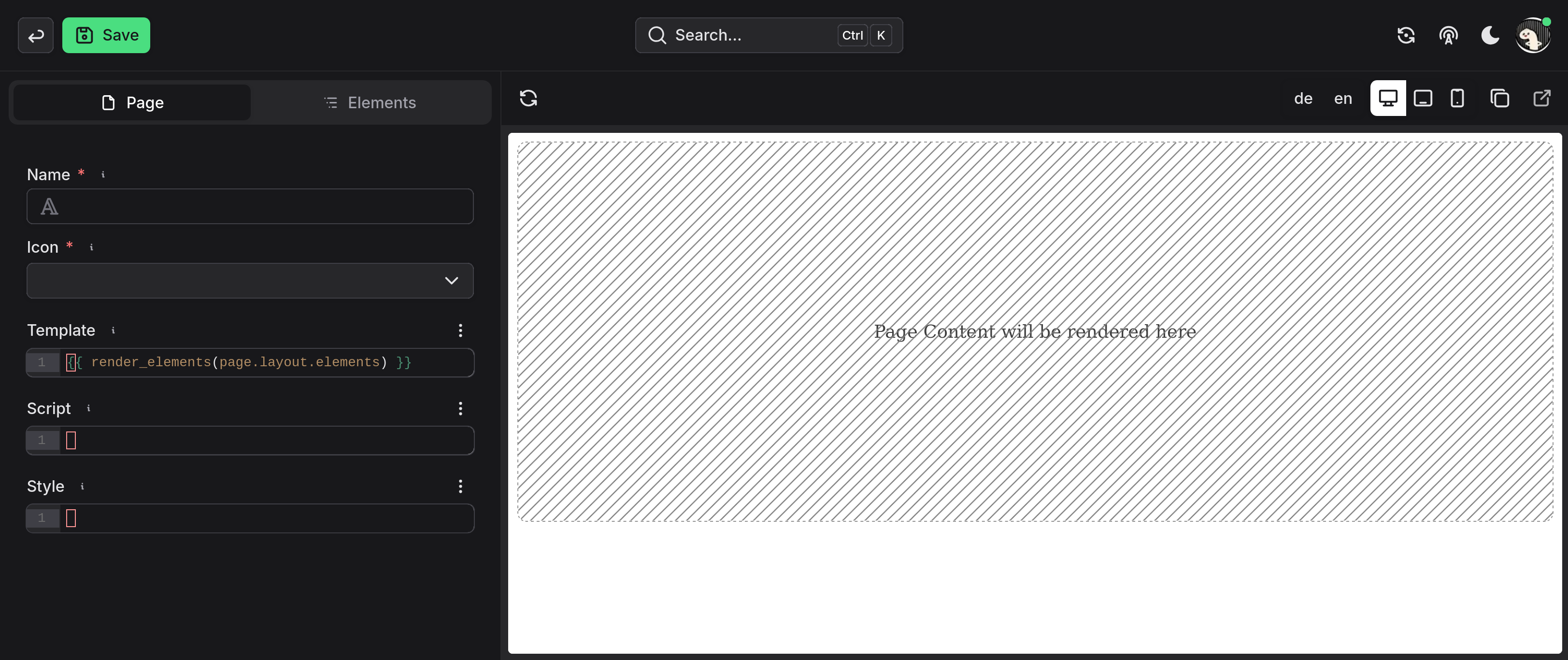 {{ render_elements(page.layout.elements) }}. This line renders the elements in
